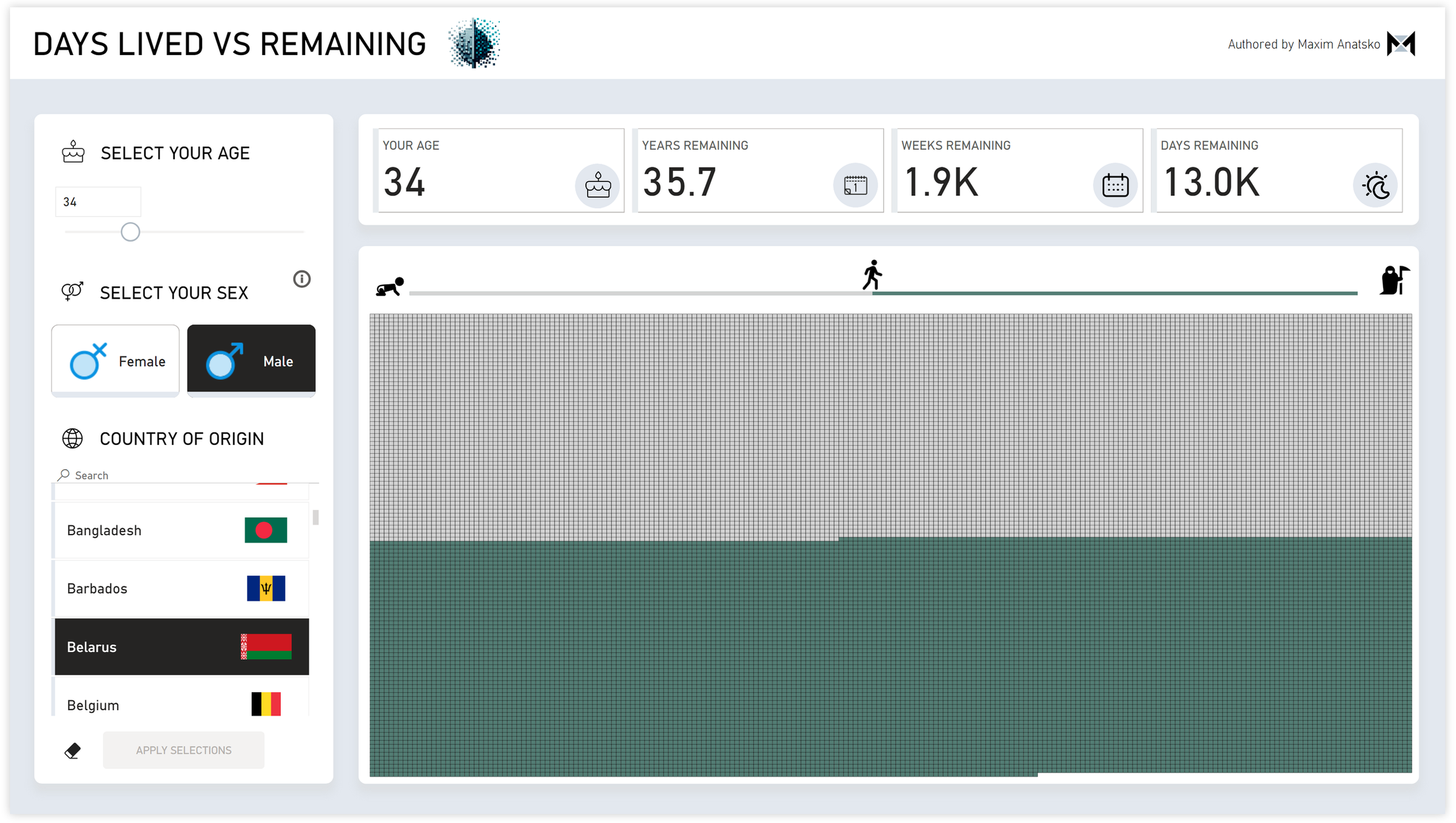 I was sitting in a cafe, working on the initial prototype, and selected my very own parameters - 34, Male, from Belarus. Unexpectedly, I started weeping right there in the cafe looking at the grid, showing simple truth - I’m somewhere mid-way in my life. Triggering a lot of reflection - am I where I want to be and doing what I want to be doing for years to come? Deep down I knew the answer.